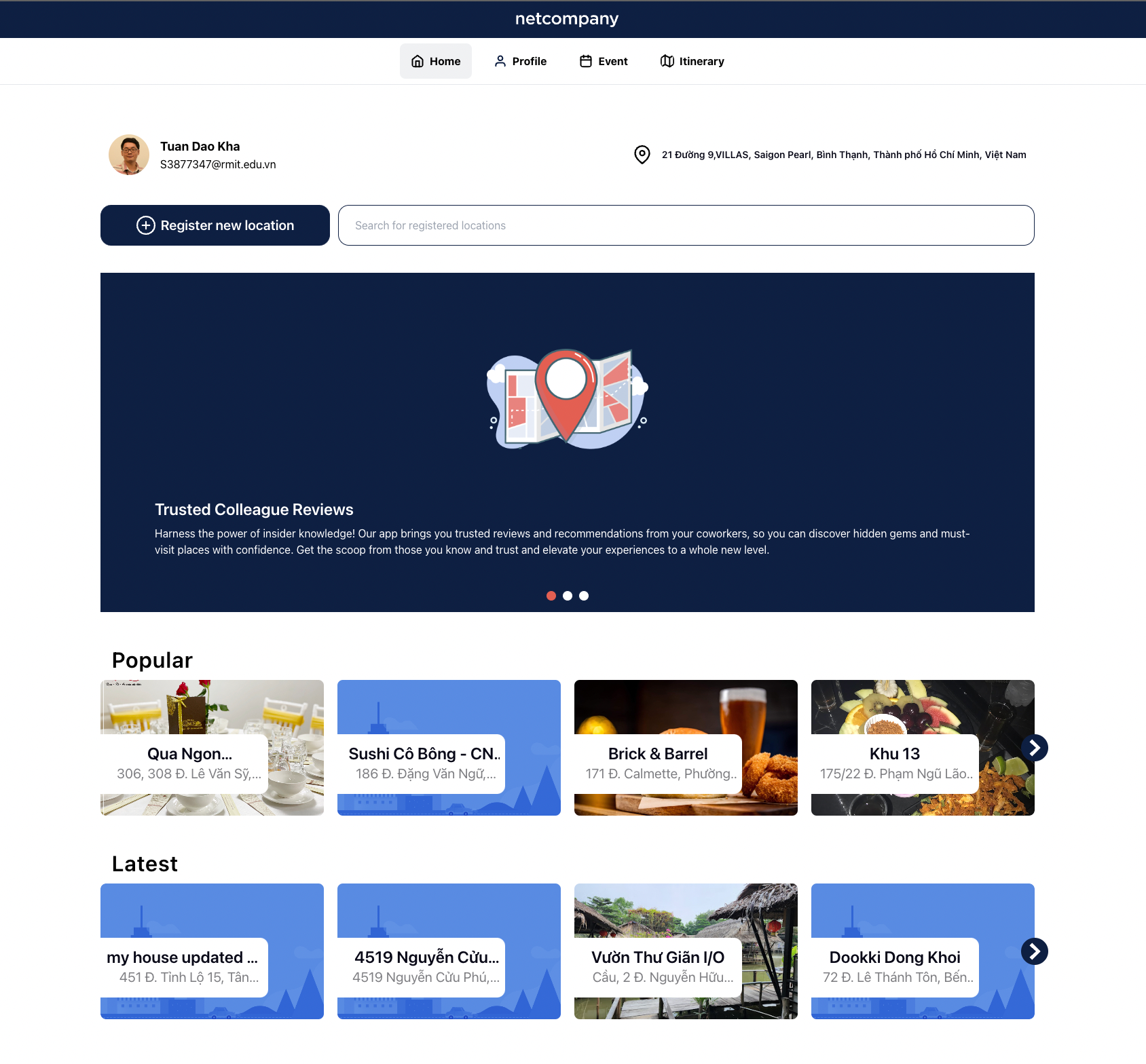 This solution encompasses 3 pivotal functionalities, namely, location recommendations, events facilitating, and itinerary planning. The harmonious interplay of these three salient functionalities distinguishes the NSS from the existing solutions. In contrast to platforms such as Facebook Groups, TikTok, or the Netcompany Afterdark application, whose main user demographic does not include expatriates and thus, proffer fragmented elements of the expatriate experience, the Netcompany Social Suggestion rises above by addressing the totality of expatriates' needs.