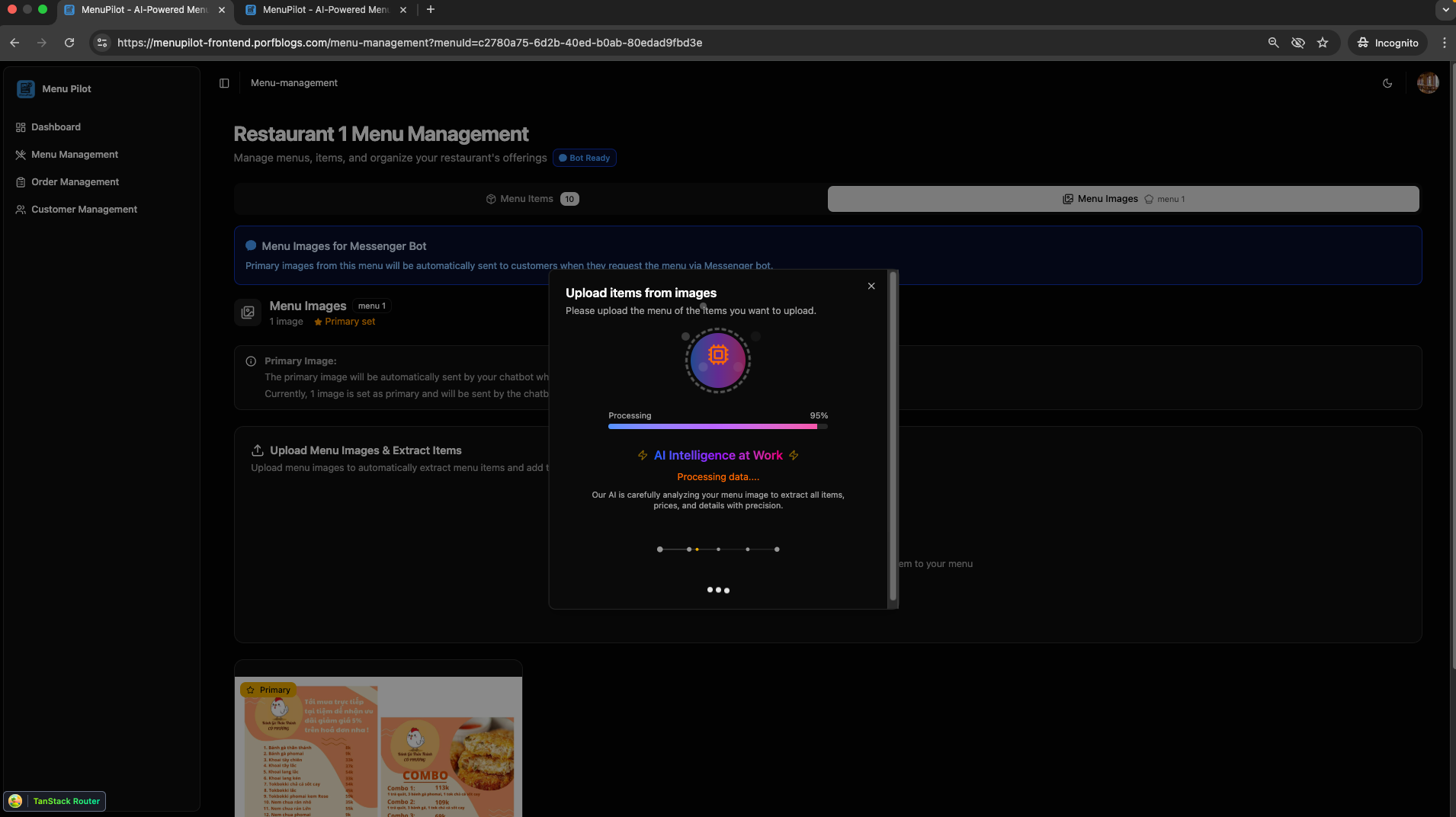 MenuPilot was created to address these issues by offering a simple yet powerful AI-driven solution. The project consists of two main parts: a management portal for restaurants, and a chatbot for customer interactions.