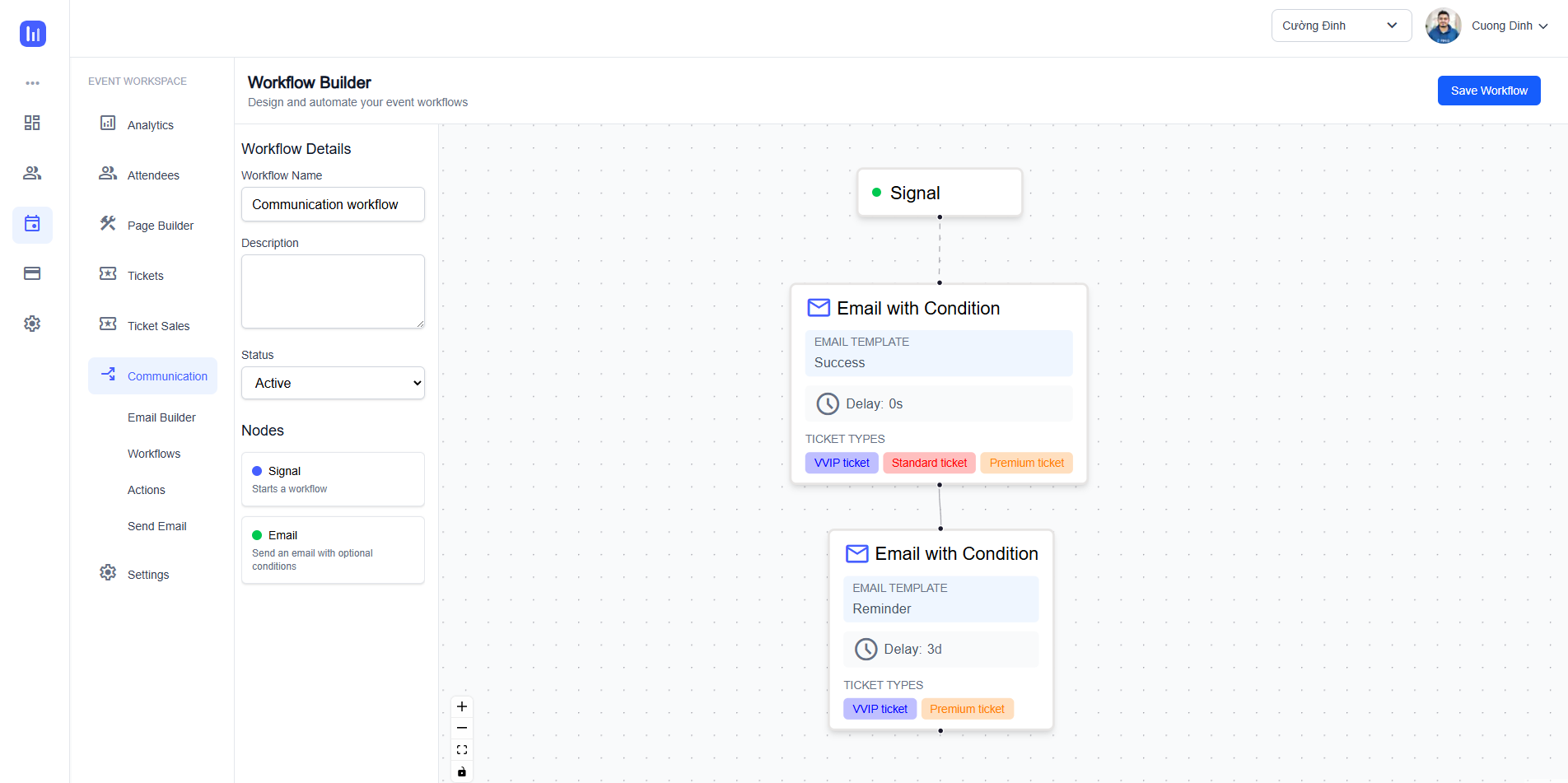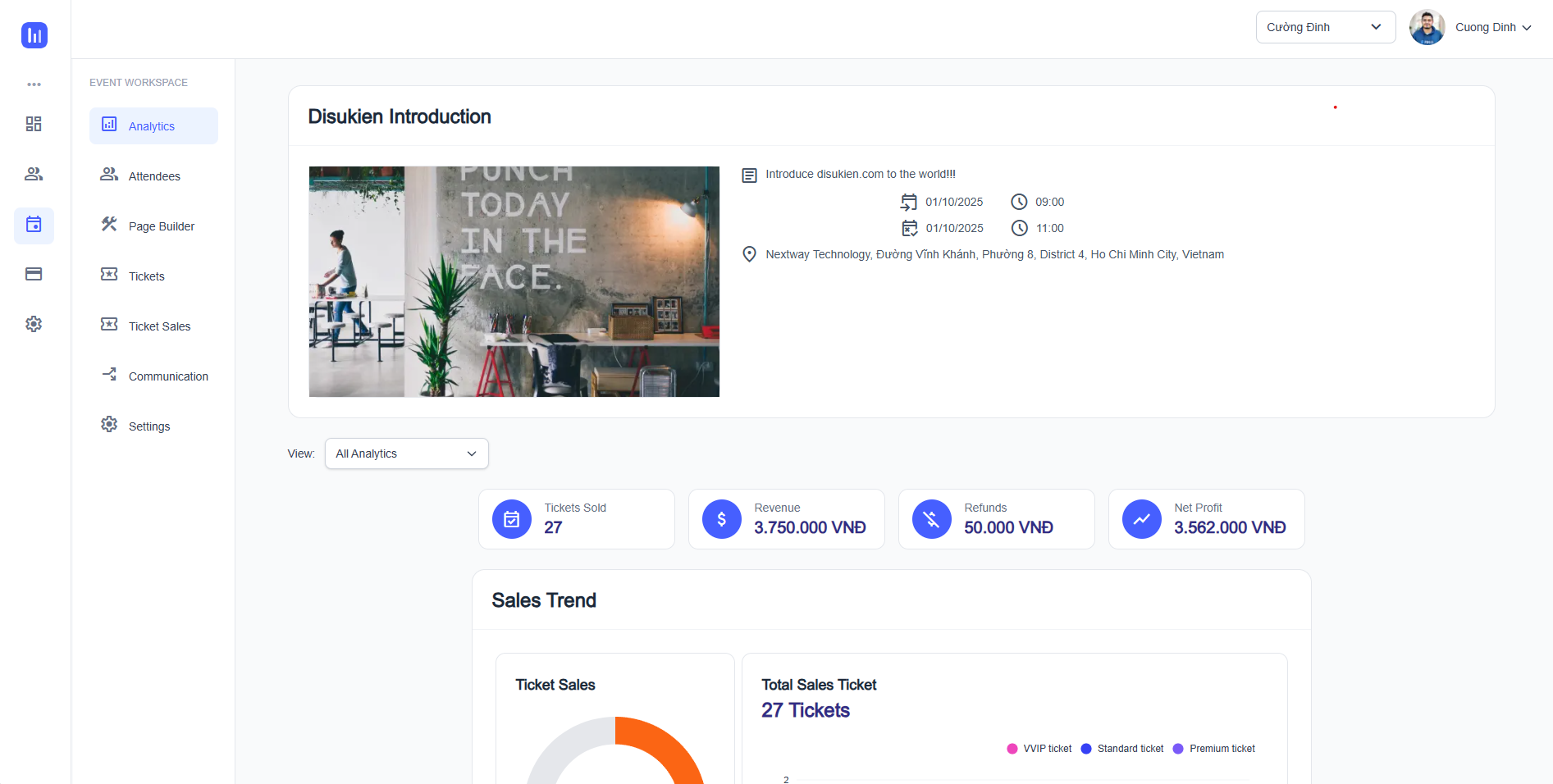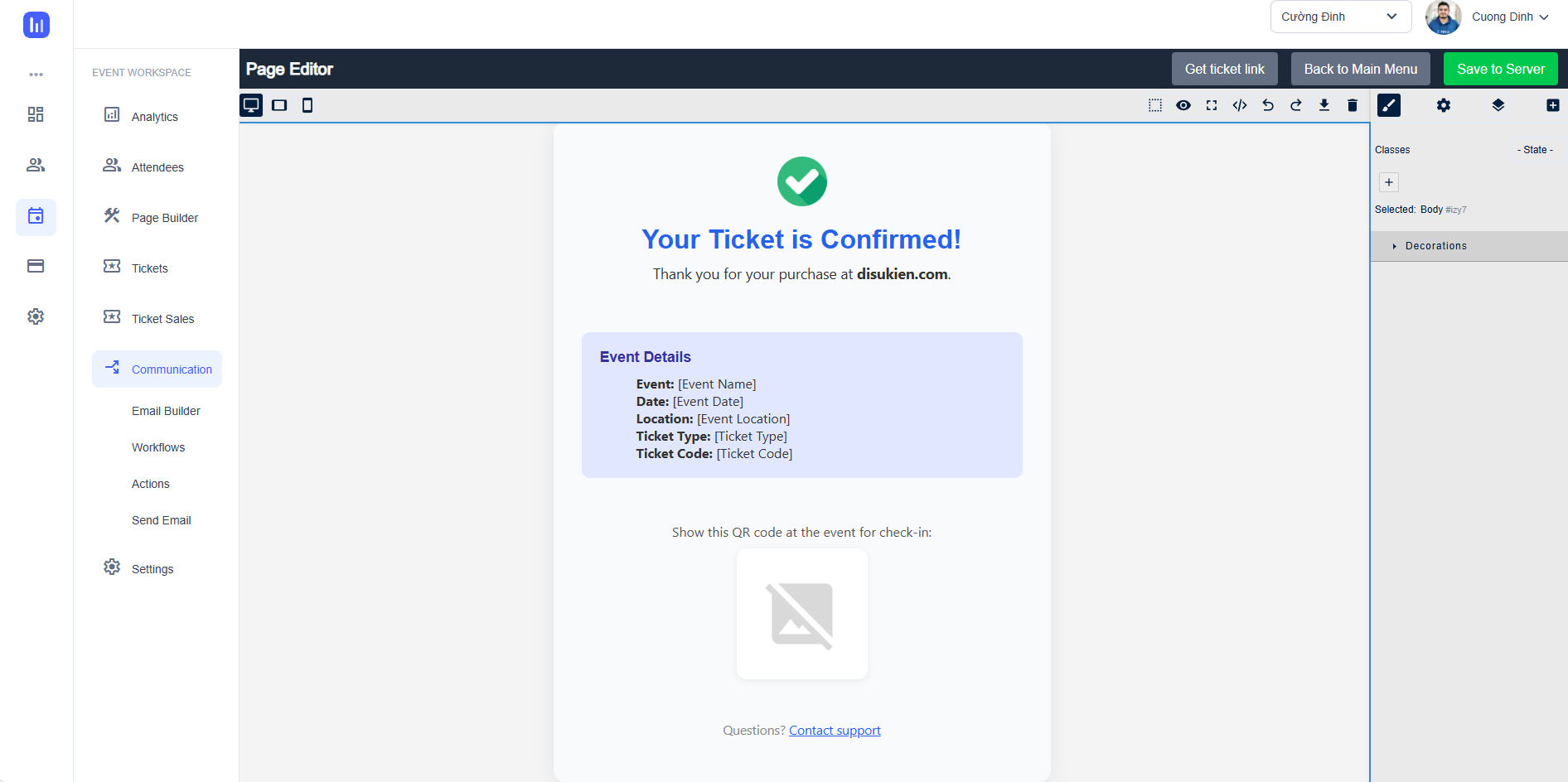 To strengthen communication, Disukien includes personalized email customization tools and automated workflow builders. For example, once an attendee purchases a ticket, the system can instantly send a confirmation email, reminders, or follow-up messages—removing repetitive tasks and ensuring consistent engagement.