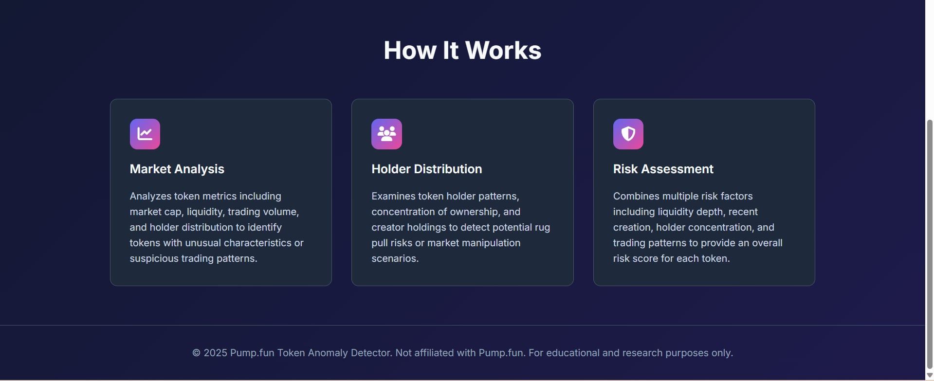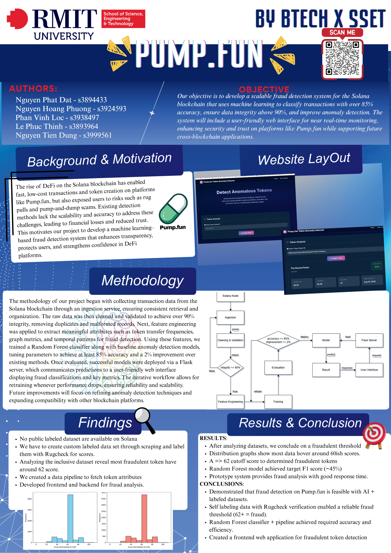 Step into the exciting world of the Pump!Fun project, a groundbreaking academic initiative led by RMIT University's BTECH team, diving deep into fraud detection on the Solana blockchain! This mission zeroes in on Pump.fun—a revolutionary platform that empowers token creation but also invites cunning scams like rug pulls and pump-and-dump schemes. These threats shatter user trust, drain wallets with hefty losses, and stall DeFi’s rise, presenting a thrilling challenge for blockchain scholars. Get ready for a game-changing, scalable solution! A powerful data pipeline sucks in blockchain data via Solana RPC calls, cleans it to over 90% integrity-a gold standard for research precision. Feature engineering uncovers key insights like transaction frequencies and graph patterns, while a Random Forest classifier aims for 85% accuracy to spot legit or shady deals, boosted by anomaly detection (Isolation Forest and One-Class SVM) that outshines baselines by 2%. Picture a sleek web interface, built with Flask, TailwindCSS, and Chart.js, delivering real-time, interactive visuals for stakeholders-perfect for academic outreach. With its modular design adaptable to Ethereum, it enhances user safety and platform trust while redefining machine learning frontiers in blockchain analytics.