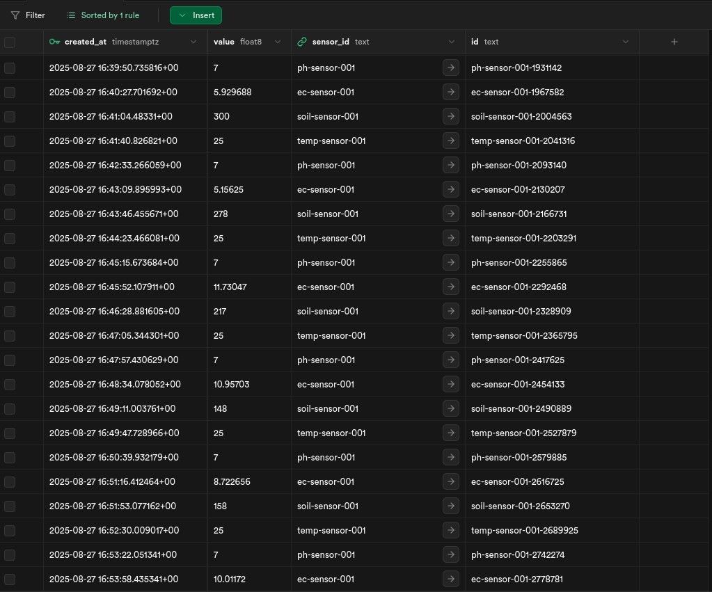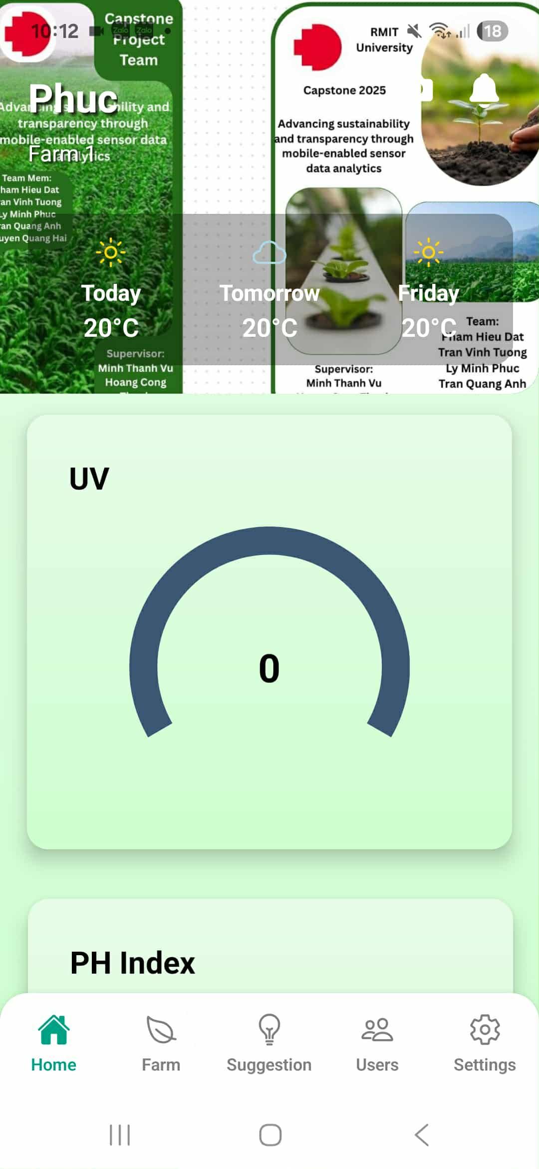 The mobile app provides farmers with real-time access to soil moisture and temperature readings as well as humidity and pH levels and UV index measurements which can be send to an AI-based recommendation system. The AI PyTorch models extract text suggestions that receive time-based filters (1, 7, 30 days) to support both short-term and long-term decision-making.