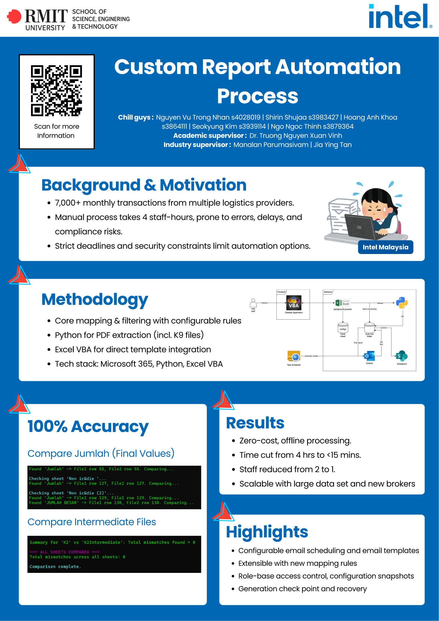 This capstone project, developed by Team Chill Guys in collaboration with Intel’s PG16 Onsite Team, delivers a fully automated solution for Intel’s monthly customs reporting process. The current manual workflow requires staff to consolidate K1 (imports), K2 (exports), and K9 (scrap adjustments) files into the M1/M2 LMW Monthly Report. This process, taking over four staff-hours each month, is repetitive, error-prone, and creates compliance risks.