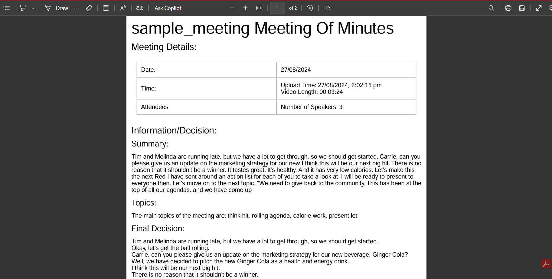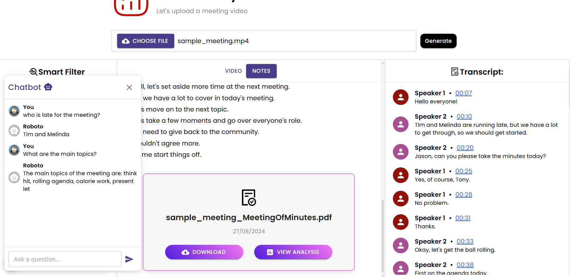 1. Video Upload and Transcription: Users can upload videos for automatic English transcription, capturing discussions and insights while generating a comprehensive meeting summary.