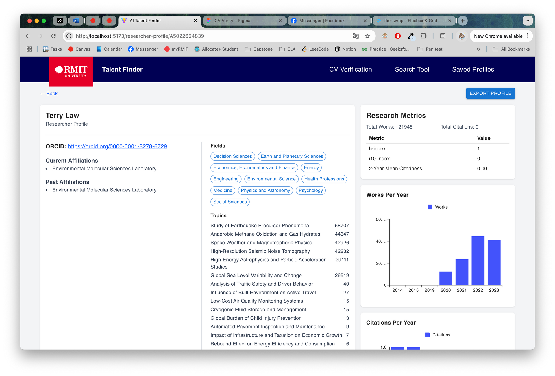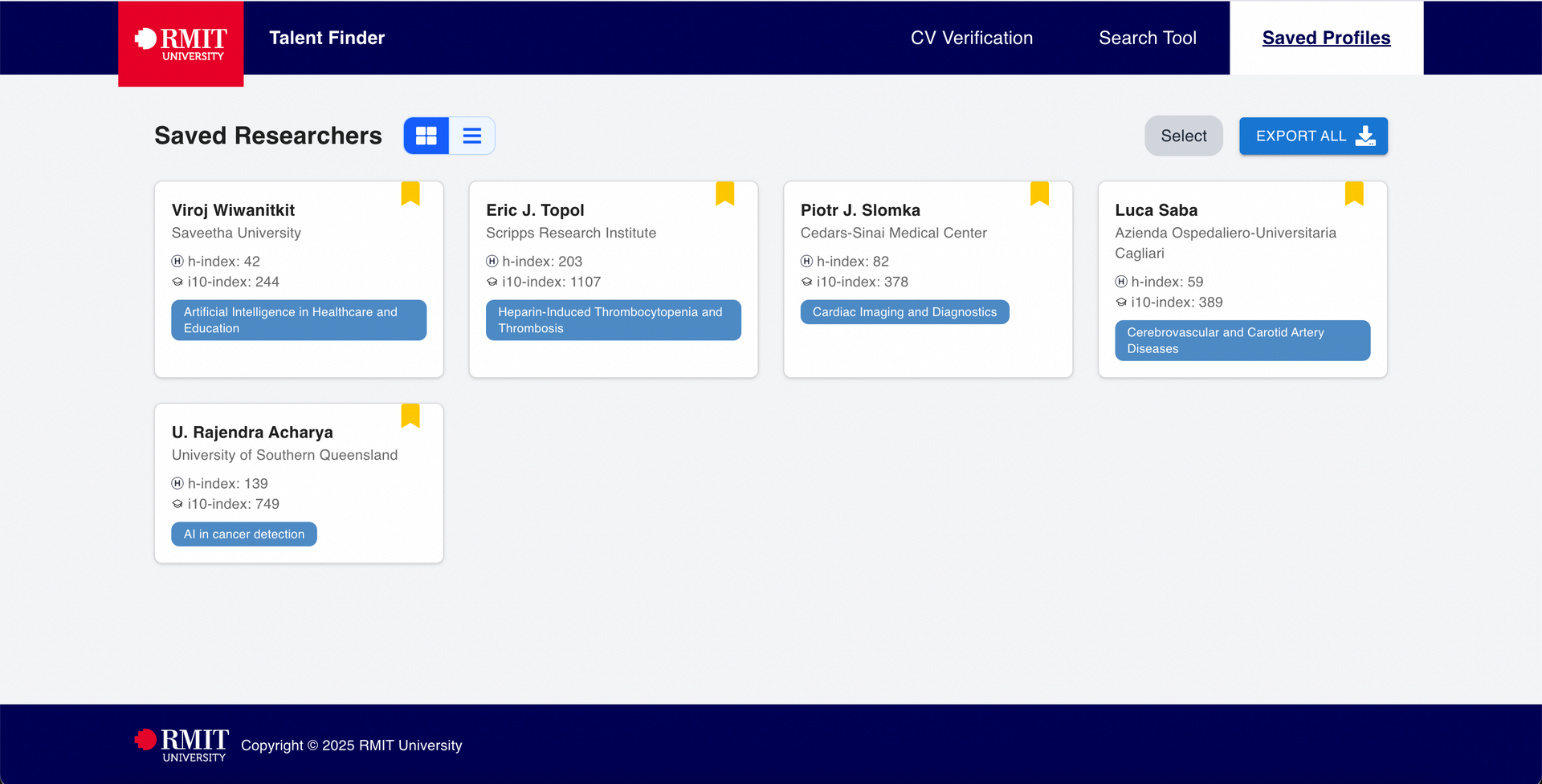 Beyond search, the platform supports bookmarking and exporting (PDF/Excel) to streamline shortlisting and reporting. Recruiters can save researchers of interest, generate structured outputs, and easily share results with decision-makers.