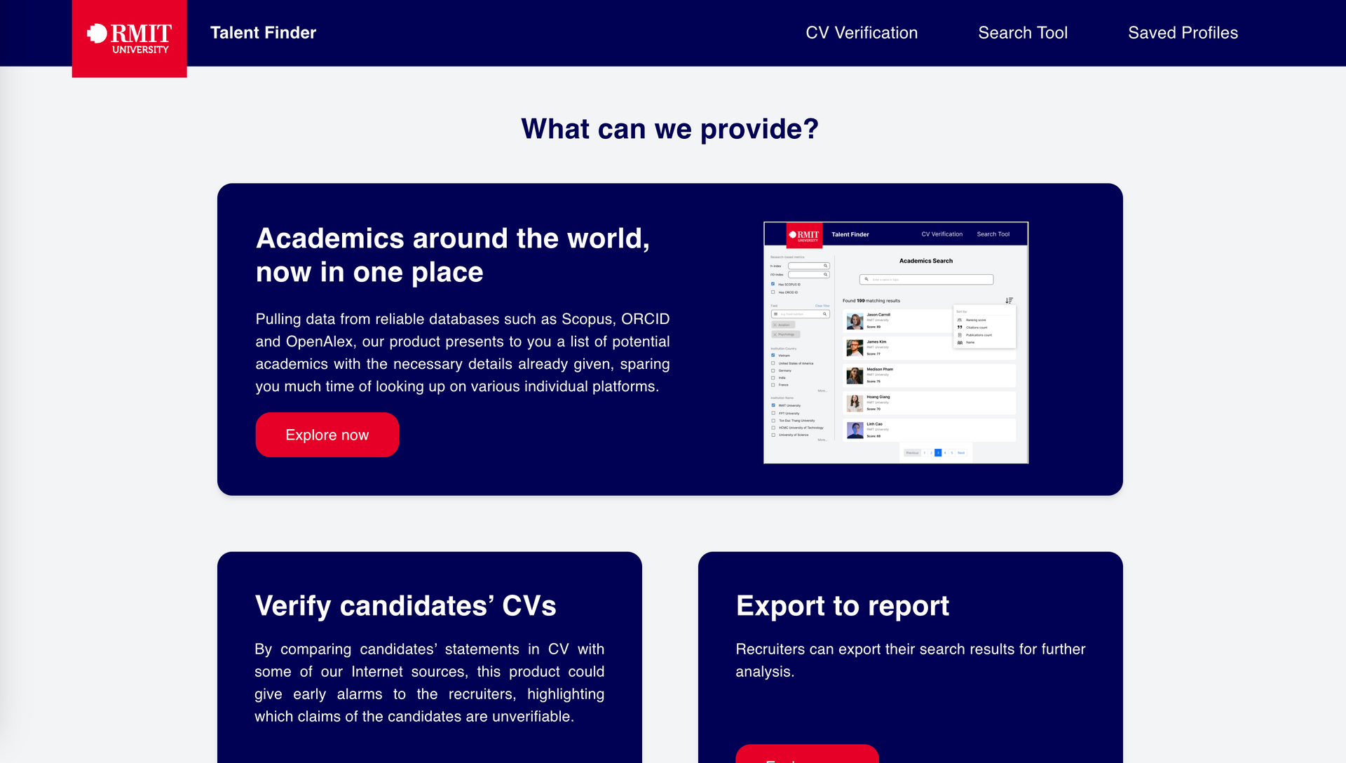 To address this gap, our team is developing an AI-driven academic talent finder platform designed specifically for higher education and research organizations. The platform integrates data from trusted academic sources such as Google Scholar, Scopus, and OpenAlex, providing recruiters with verified researcher profiles that include publications, affiliations, and performance metrics. A powerful search engine with filters for expertise, h-index, and institutional background allows recruiters to quickly identify suitable candidates.