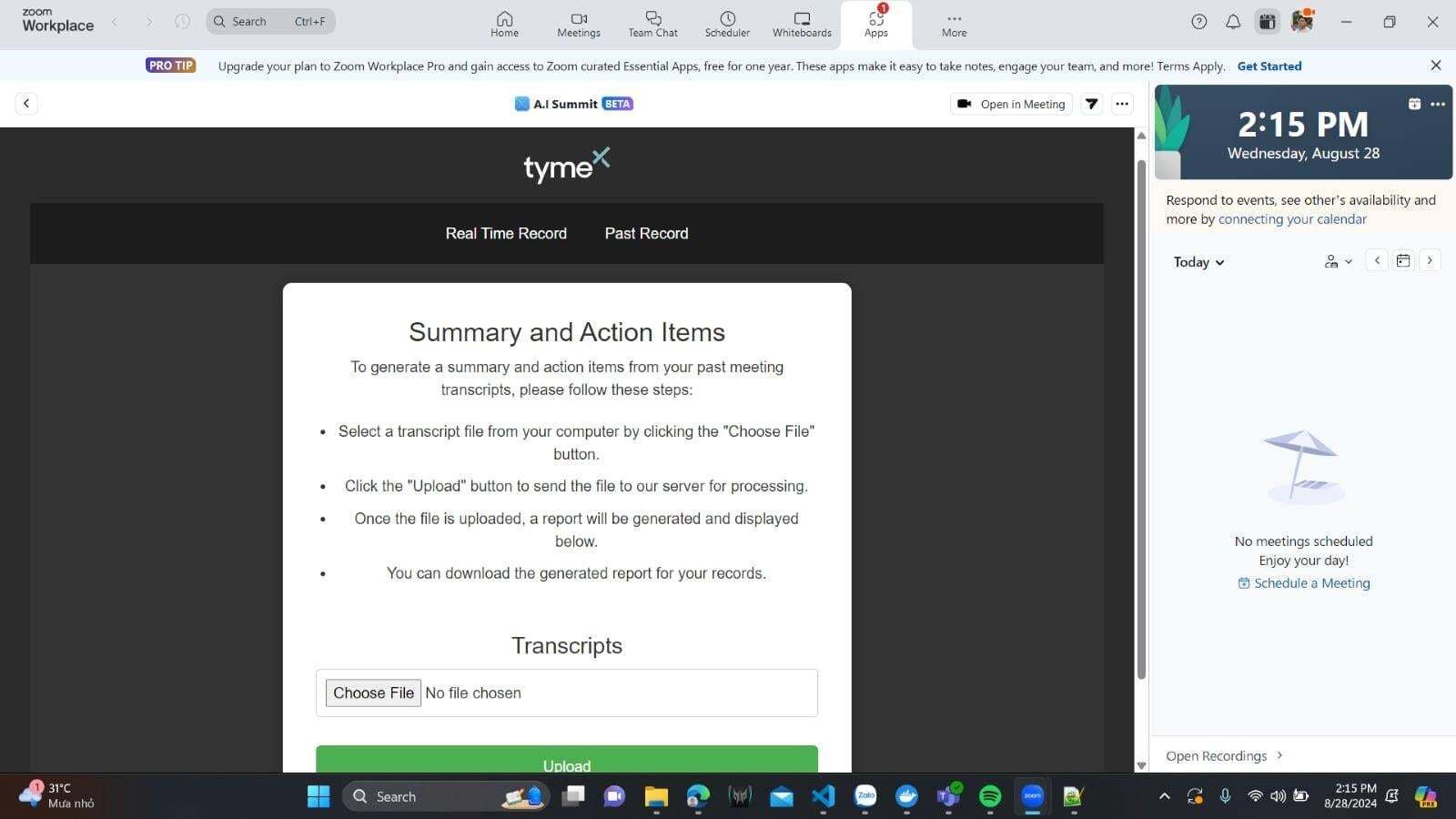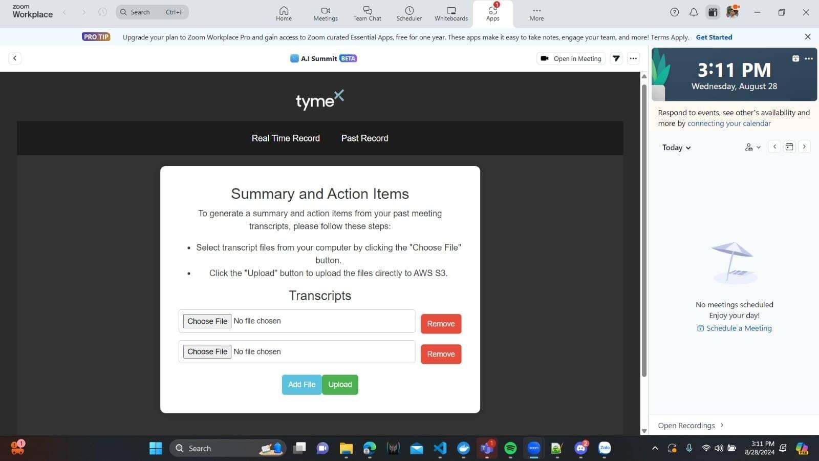 AI-Summit is an AI-driven tool designed to provide customized meeting and conference summaries tailored to individual roles. The primary goal of this tool is to minimize the time spent on notetaking, streamline the process of digesting and understanding meetings, particularly when they are lengthy and complex. By allowing participants to focus more on active engagement during the meeting, AI-Summit enhances productivity and enables more effective contributions. Additionally, participants receive personalized summaries based on their specific roles. The project's deliverables include a fully operational AI-powered tool integrated with Zoom/Teams and comprehensive user documentation.