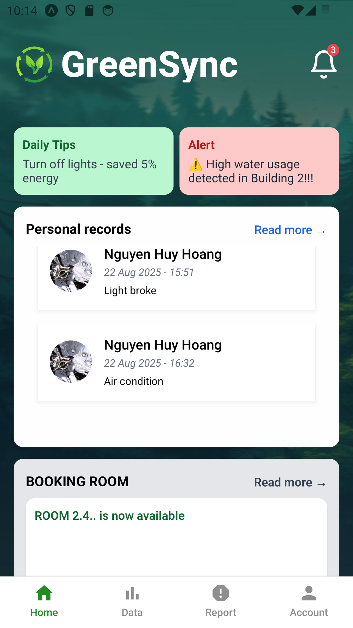 This project addresses the problem by developing GreenSync, a smart sustainability management app designed specifically for RMIT. The system collects data on electricity, water, and air quality from available sources and integrates them into one platform. Using real-time processing and clear visual dashboards, GreenSync provides actionable insights, alerts, and reporting tools. Beyond tracking, the app also includes features such as lab room booking and issue reporting, making sustainability more accessible and engaging for students and staff.