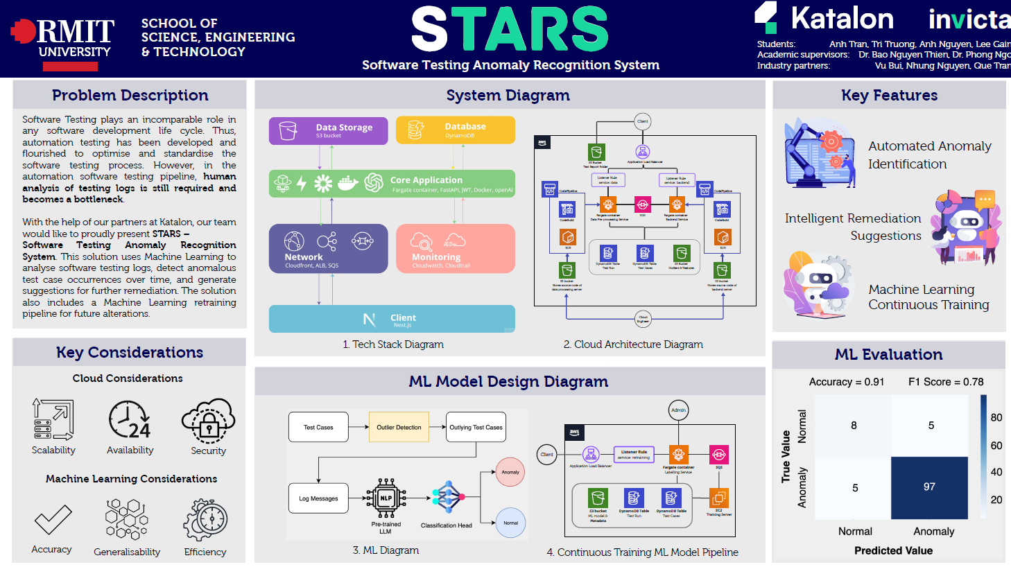 To address these limitations and allow the development of software to be even further streamlined, our team has worked with our industry partners at Katalon to procure expert domain knowledge on software testing and identify the most vital and impactful aspects of log analysis that could potentially vastly accelerate the workflow of developers. Armed with these critical insights and the advent of Machine Learning, our team present STARS – Software Testing Anomaly Recognition System – a solution that is capable of analysing software testing logs and detecting anomalous test case occurrences through time, as well as generating suggestions for further remediation. The solution also comes with a continuous training pipeline for future alterations to the distinctive Machine Learning models for separate users.