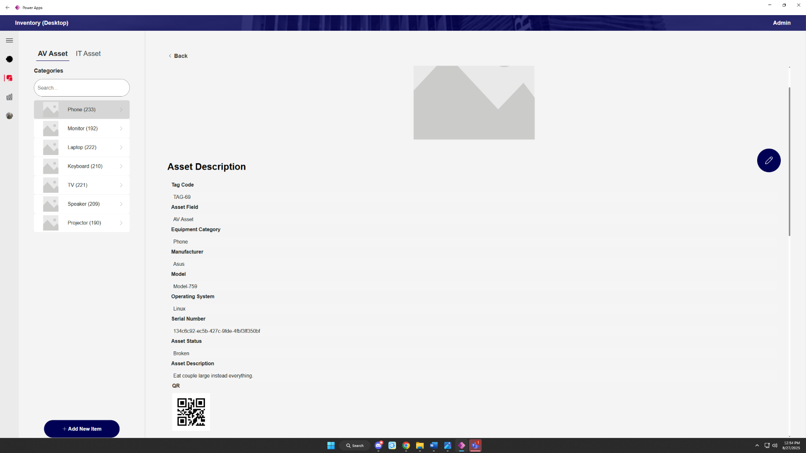 Our application introduces automation and digital oversight through its four core features. Firstly, an item QR scanner for instant and accurate device identification and stocktaking. Secondly, a centralized asset inventory database which can be easily accessed. Thirdly, improved stocktaking tools and report generation for streamlined audits. Lastly, user friendly in-app item CRUD management capabilities for ease of use. Built on an already implemented and integrated Microsoft Power Platform and SharePoint, our application which is available on multiple platforms eliminates manual data entry, drastically improves operational efficiency, and provides real-time visibility into the entire asset inventory. Our project delivers a scalable, sustainable, and future-proof framework designed to support the university's growth, reduce administrative overhead, and mitigate critical audit risks.