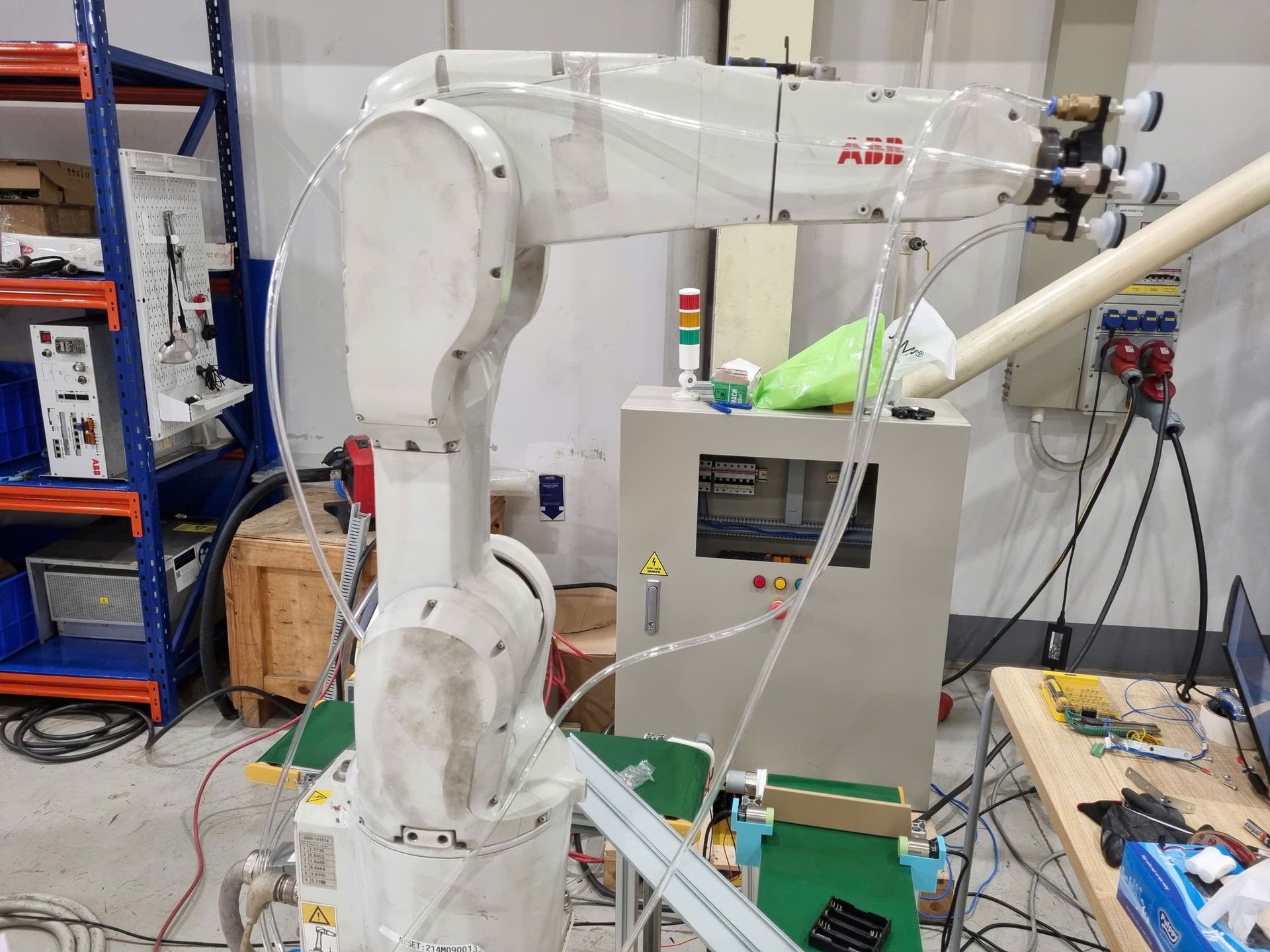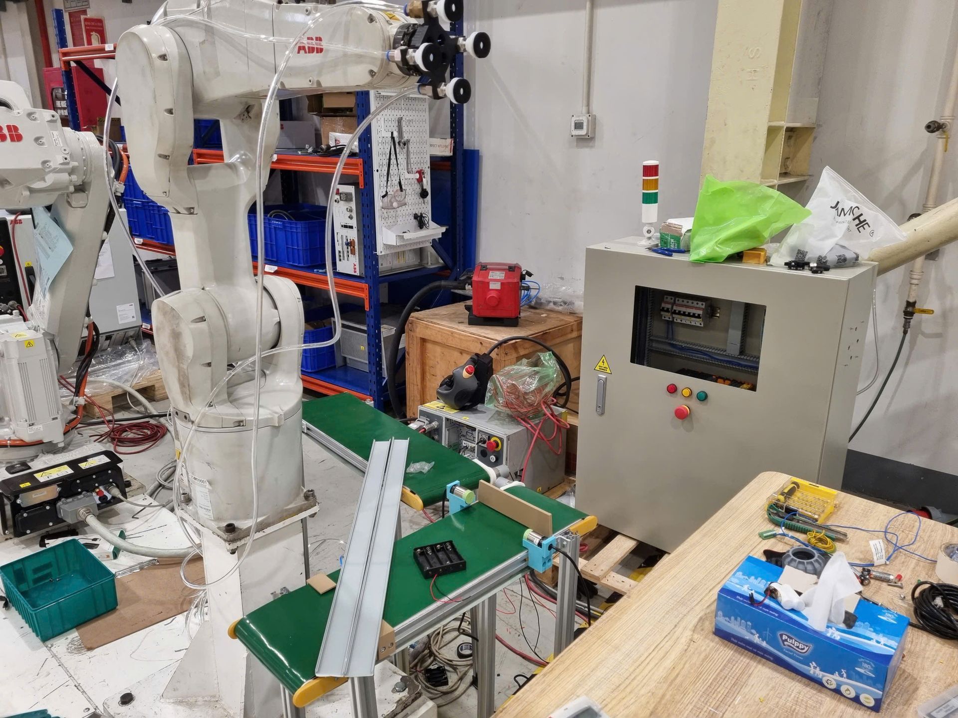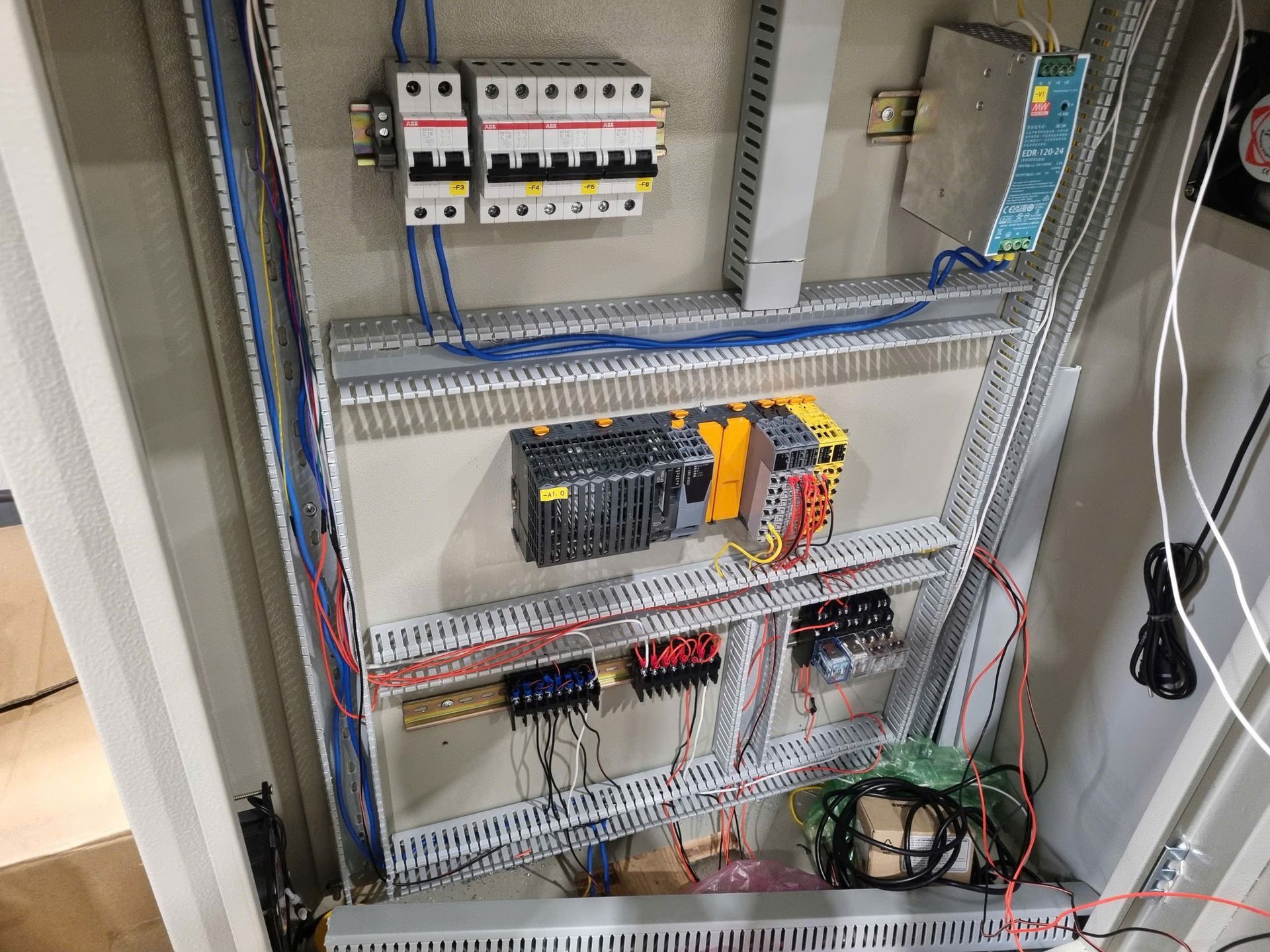 A modular control system and electrical cabinet for an ABB robot production cell. The IRB1200 performs pick-and-place to sort two item types using object and height sensing. A standardized architecture links PLCs, sensors, HMI, and network services, enabling fast integration and training. A web dashboard reports uptime, item throughput, and alarms. The prototype demonstrates reliable PLC–robot communication and an Industry 4.0-ready baseline that can be expanded to additional stations and data analytics.