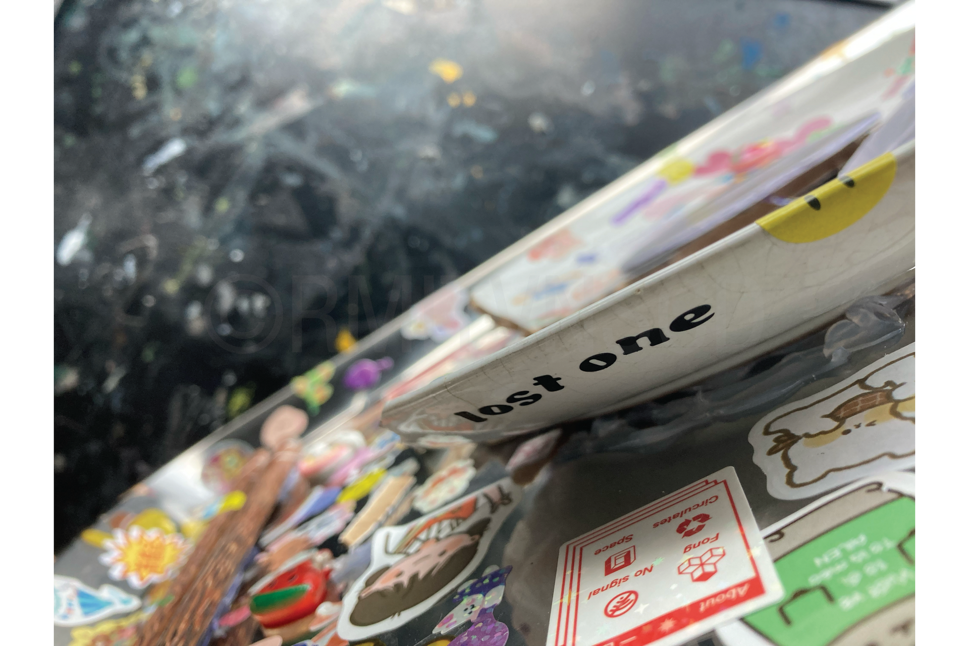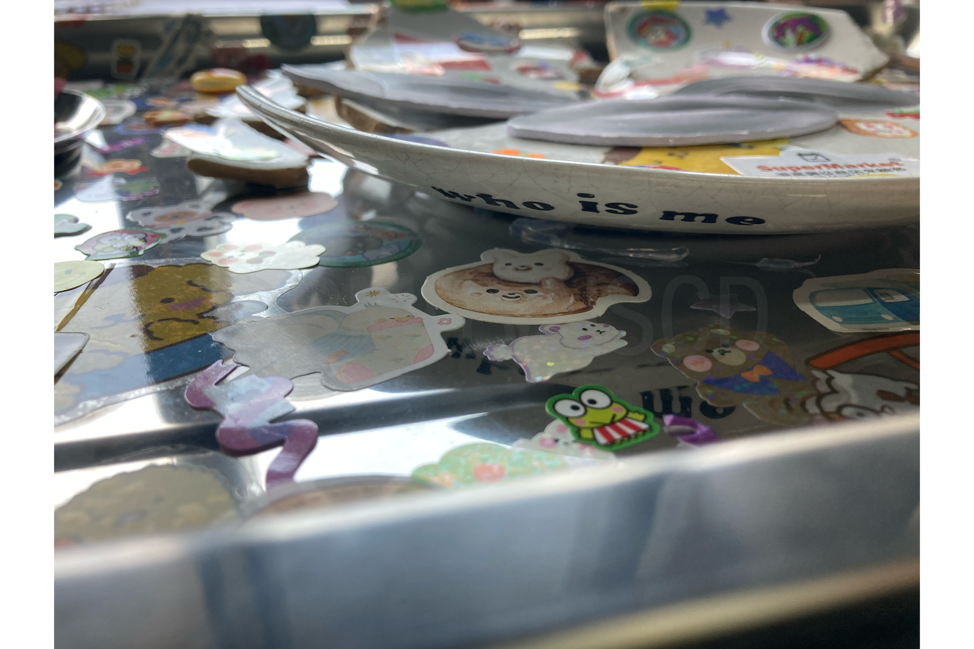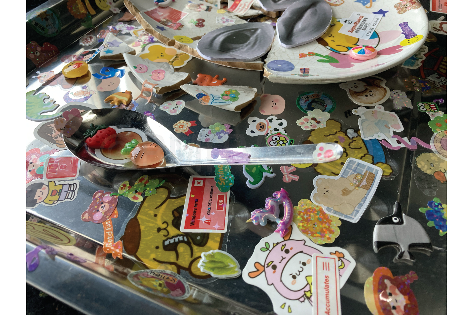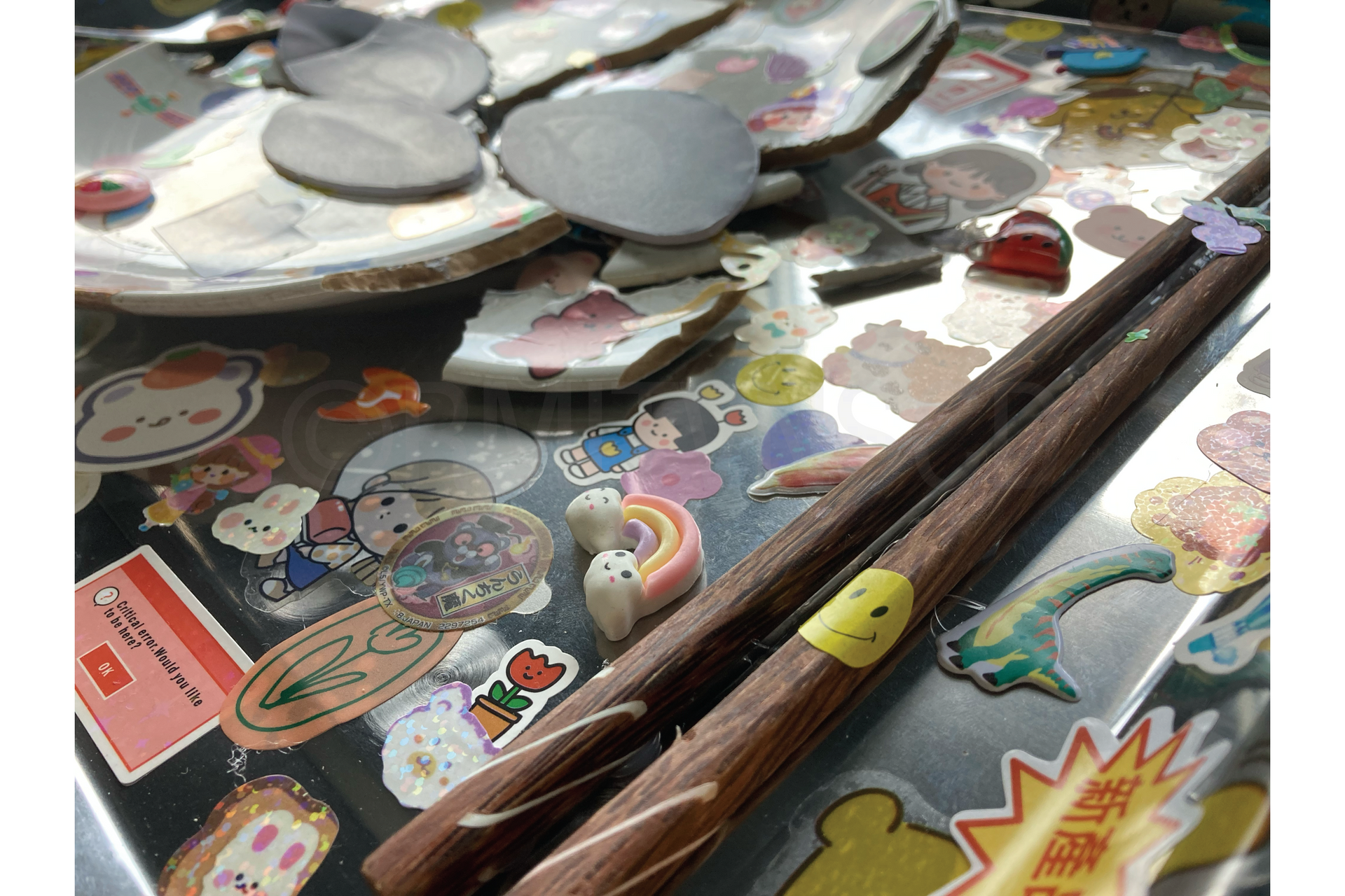 In my artwork, the multimodal technique is incorporated. I use different materials I can find, such as wares, utensils, and decorative accessories. It helps to illustrate the feeling of instability, with the stickers working as bandages to hold the broken pieces together. The colourful charms also help to visualize the contrast between the vibrancy of the decorations and the monotonous objects.