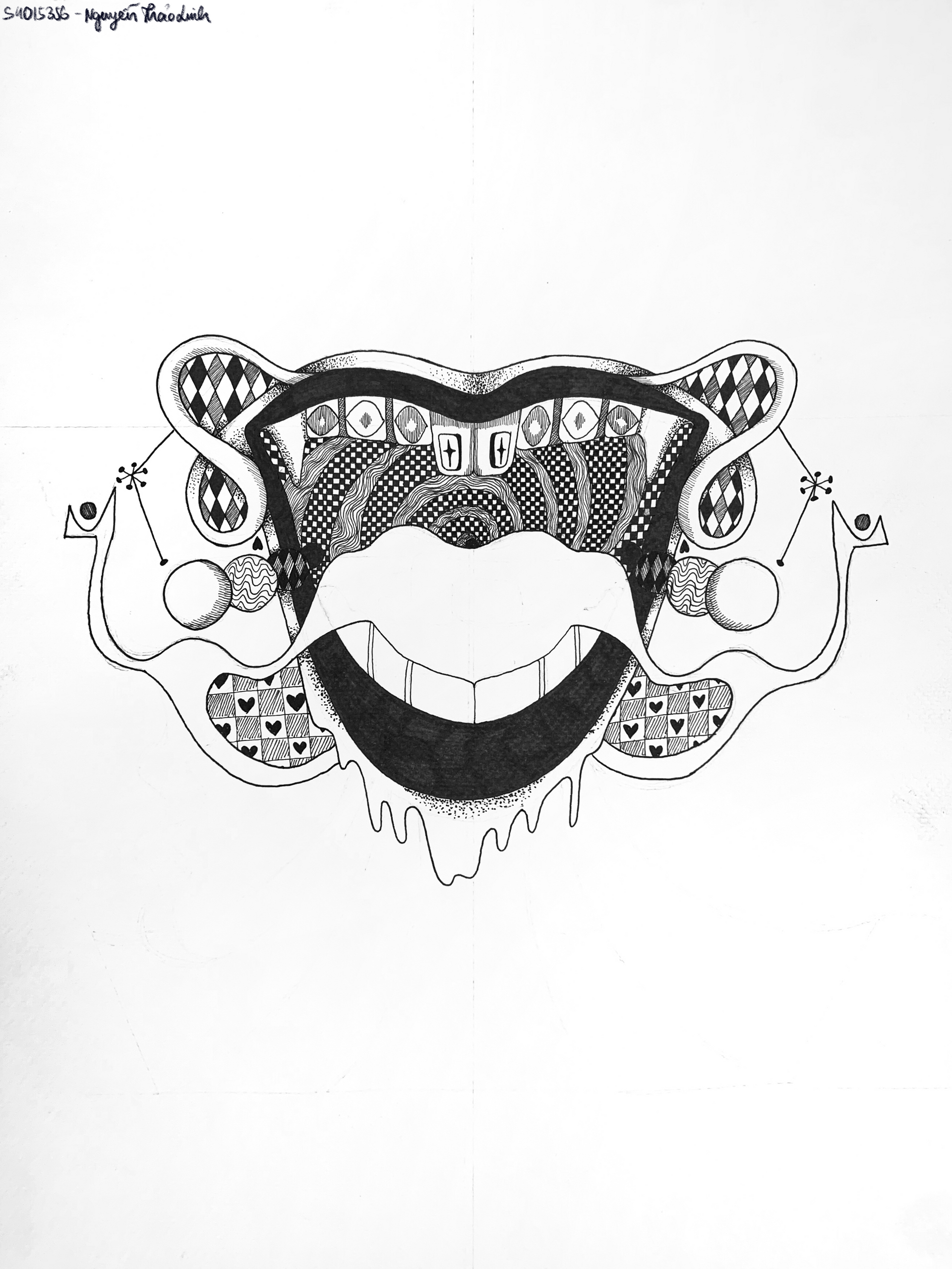 Despite undergoing numerous changes from the original vision, the final model still contains a certain set of materials. Paper is prevalent throughout the model, as its flexibility allows for shaping however I want my wavy patterns to turn out. The metal wires go under from the most striking to the most miniscule of details, holding the model altogether and strengthening the structure in general. Initially, I planned for the model to be coated with gold paint, the opulent signature of midcentury design, but after a small (and perhaps a happy) mistake, the colour was changed to copper. Coincidentally, the copper shade matches with the pearlescent features attached on it more than gold does. One might consider the spaciousness of “Libertanoia” to be lacking; however, I think it prevents their judgment from being constrictive in a visual sense. As one observes the model from the side view, they can witness how the curves flow out from the “mouth-cave”. This is where the model bears resemblance to my haptic drawing, and it is the one key feature I would like the audience to notice when they are looking at my work.